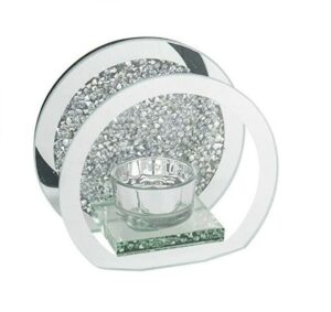Make your tea lights into an elegant display with this Round Crushed Crystal Tea light Holder. Featuring a round holder held between two panels of glass, the back panel has a pond of tiny jewels that will sparkle in the glow of your candle for a truly stunning effect.