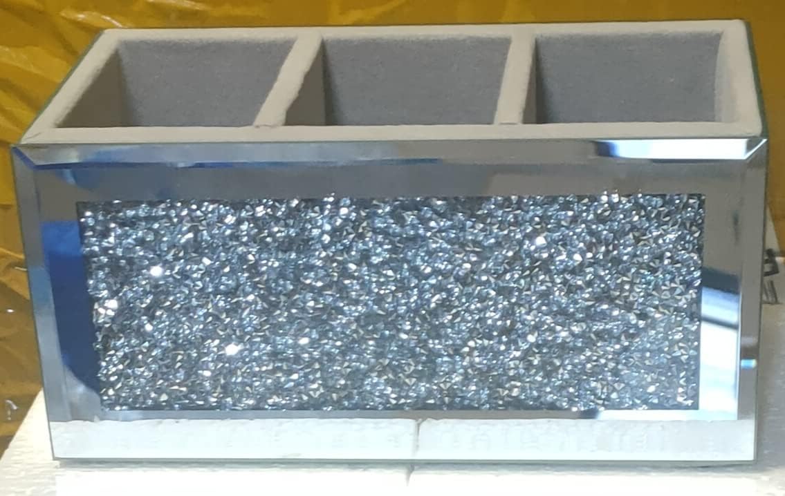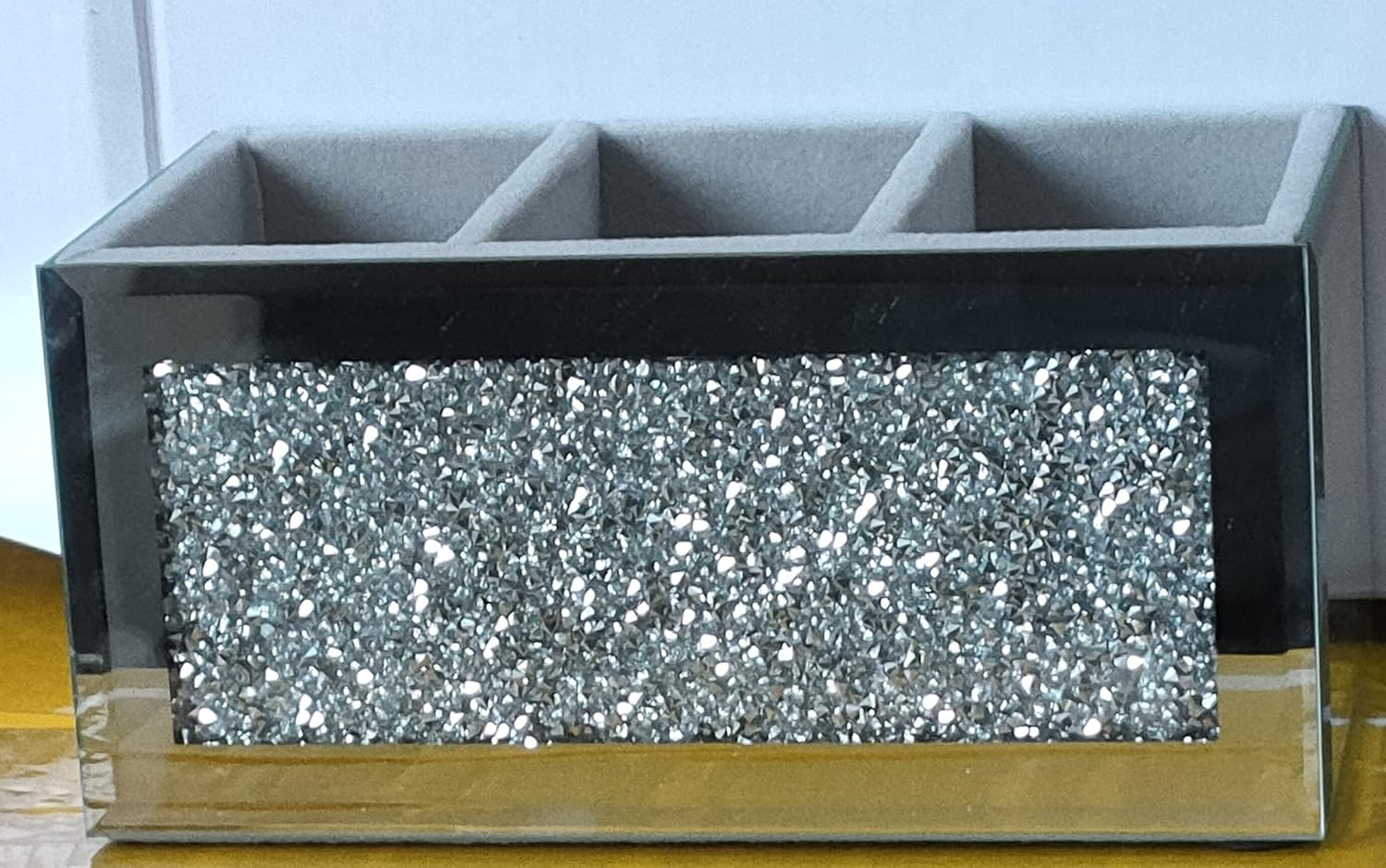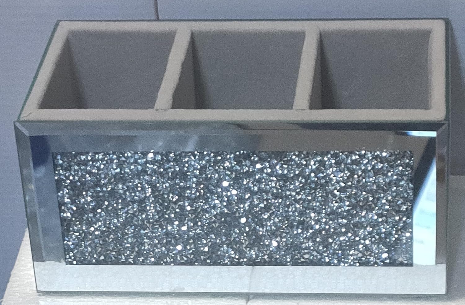 This make up brush organiser keeps your cosmetic accessories organised in a chic way with this Crushed Crystal Beauty Box, This box has three compartments to store your brushes, blenders, files, and tweezers. This ideal for dressing table organiser is covered in reflective glass with a panel of encased crystals for a truly glamorous touch.