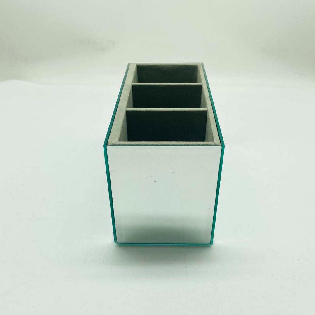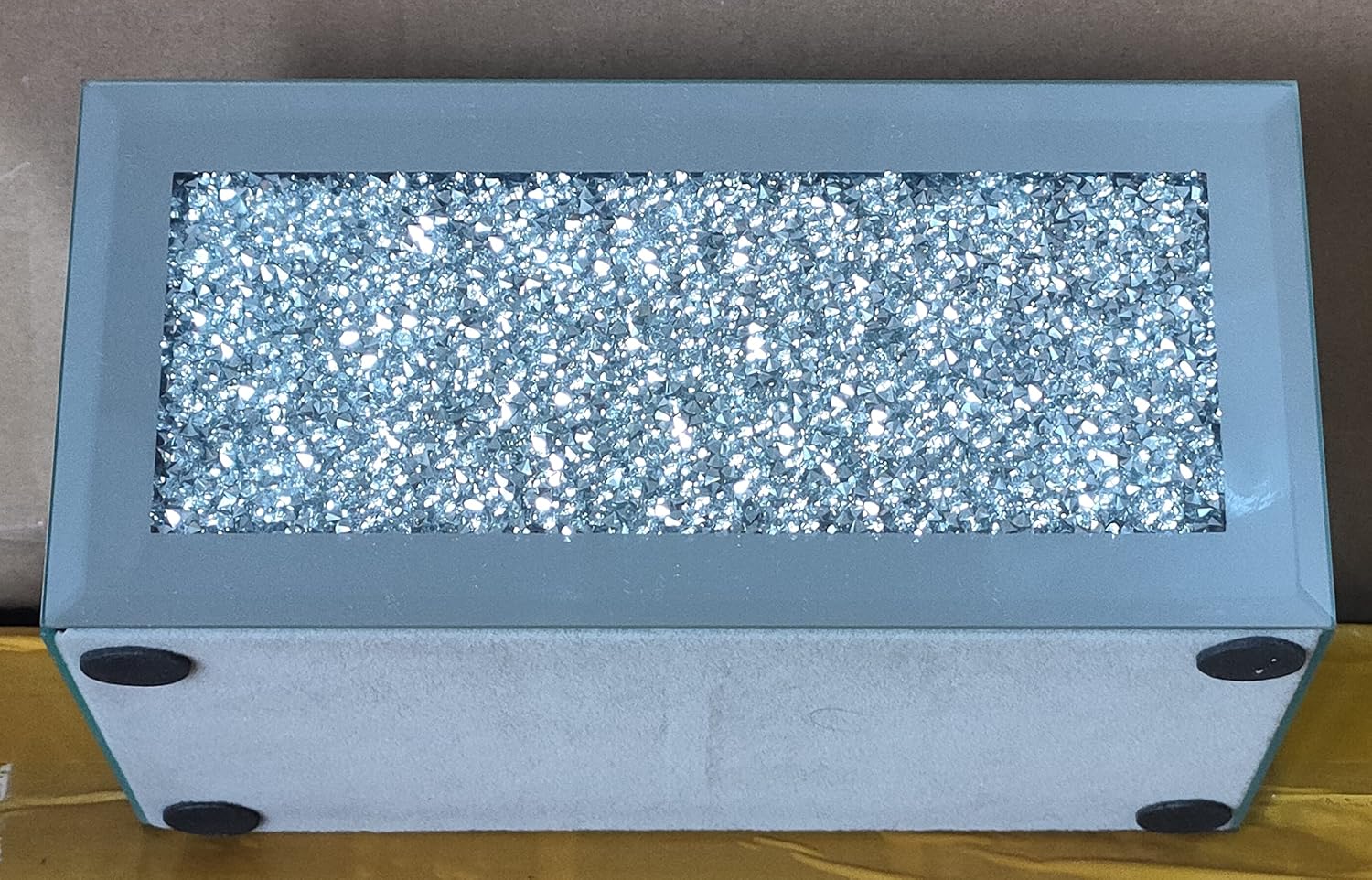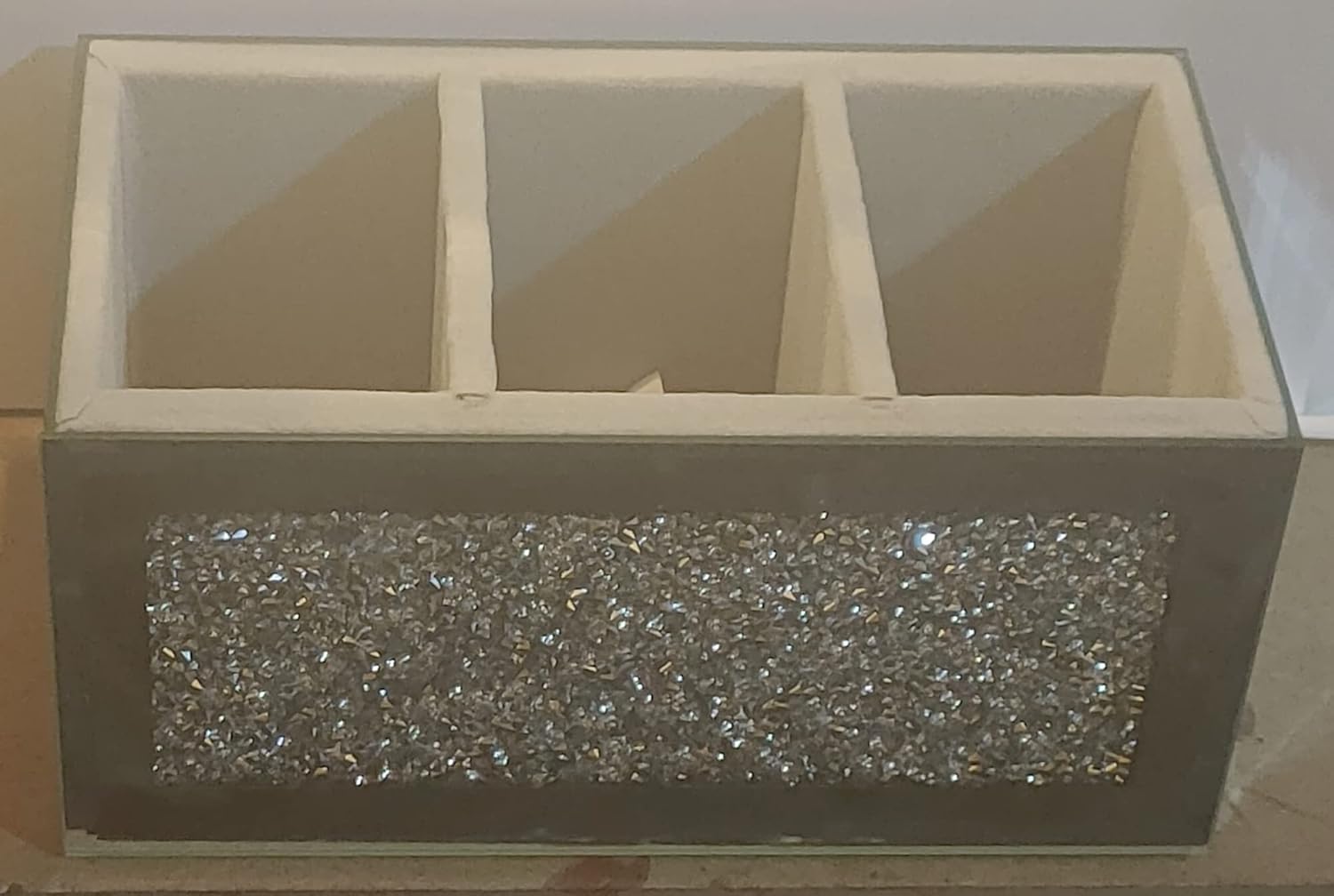 This make up brush organiser keeps your cosmetic accessories organised in a chic way with this Crushed Crystal Beauty Box, This box has three compartments to store your brushes, blenders, files, and tweezers. This ideal for dressing table organiser is covered in reflective glass with a panel of encased crystals for a truly glamorous touch.