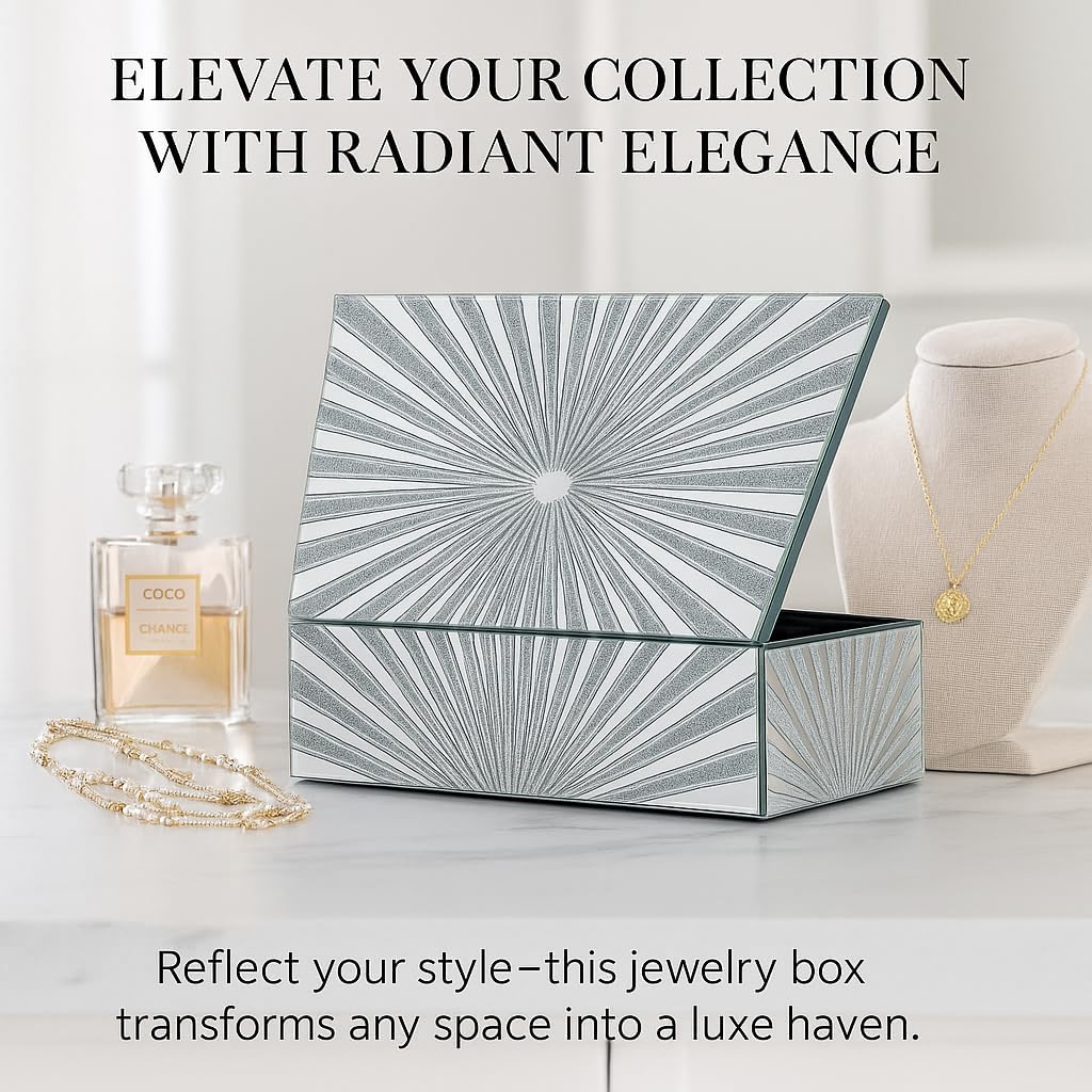 Sunrays Silver Glass Mirrored Jewellery Box Organiser Modern Trinket Storage Box Earrings Rings Jewelry Keepsake